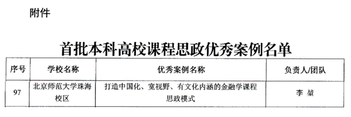 近期,广东省教育厅公布了全省首批本科高校课程思政优秀案例名单,经各高校推荐、专家遴选,共评选出全省本科高校课程思政优秀案例124个。北京师范大学珠海校区李堃副教授报送的“打造中国化、宽视野、有文化内涵的金融学课程思政模式”案例获评全省首批本科高校课程思政优秀案例。