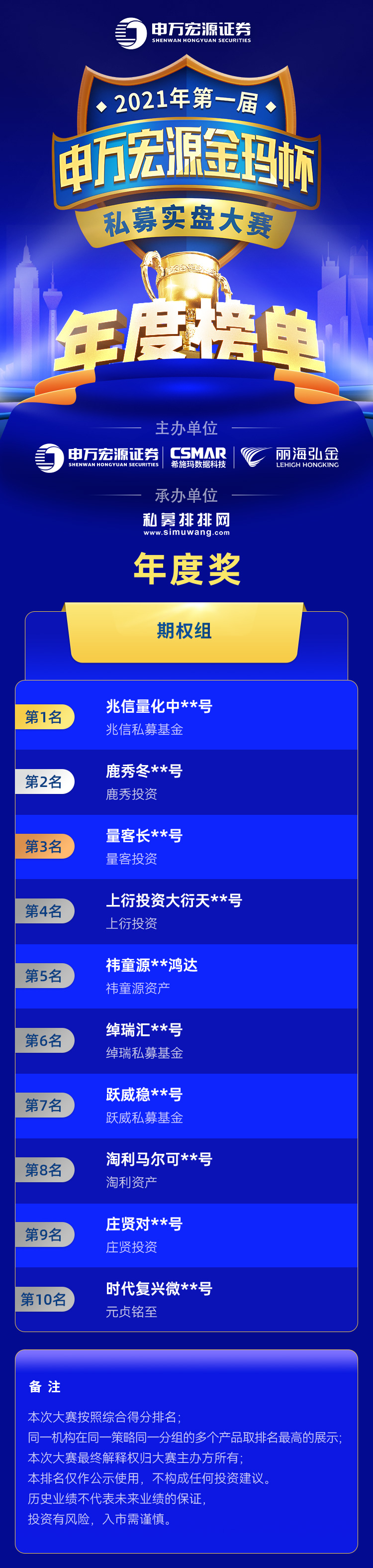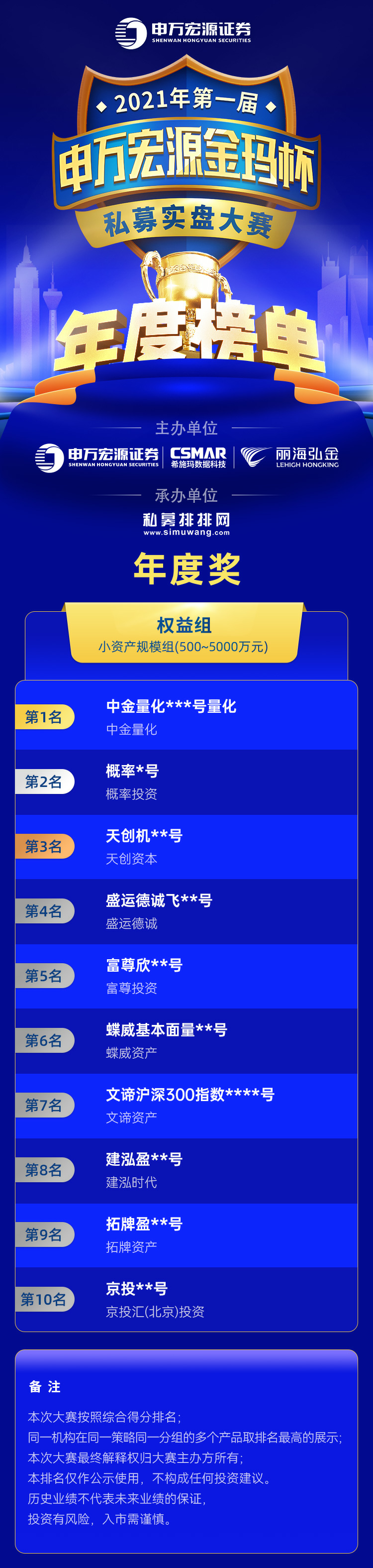 此外,申万宏源金玛杯私募大赛还特设最具潜力奖、收益明星奖、风格稳健奖、新锐私募奖等4个年度特色奖项,获此殊荣的私募基金分别是“京投**号”、“万柏强**号”、“上海宽德金刚**号”、“概率高**号”,由京投汇(北京)投资、万柏投资、宽德投资、概率投资担任管理人。
