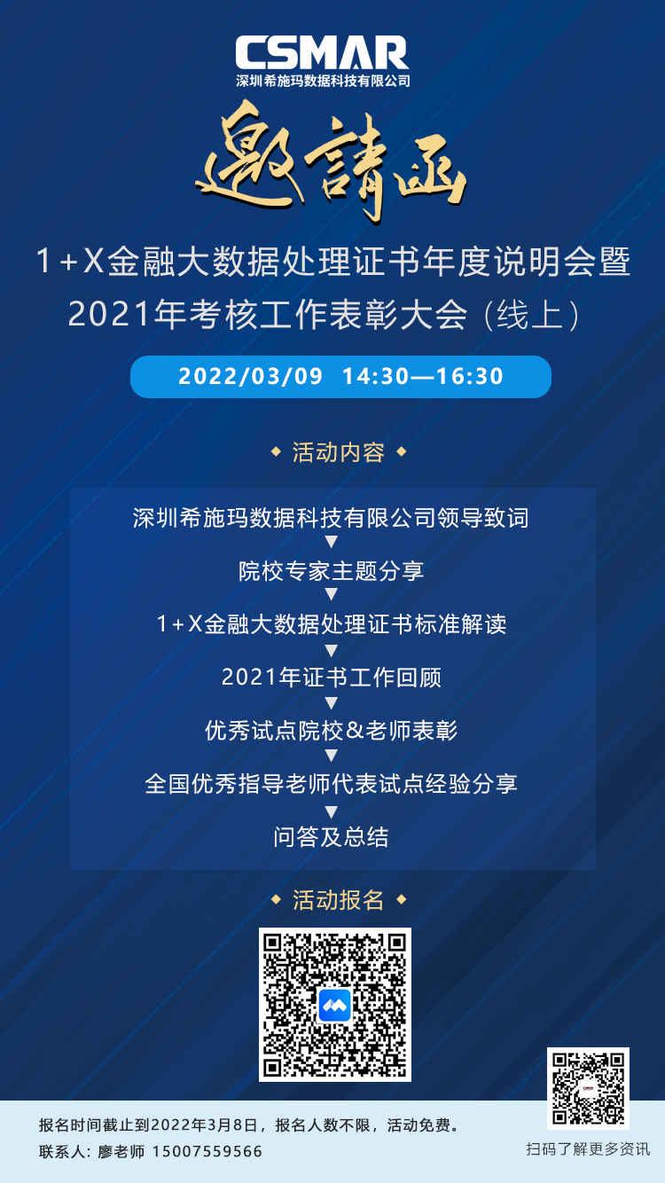为深入贯彻落实《国家职业教育改革实施方案》和教育部办公厅等三部门《关于推进 1+X 证书制度试点工作的指导意见》等有关文件精神,扎实推进1+X金融大数据处理证书制度试点工作,深圳NO钱包官网数据科技有限公司(下称深圳NO钱包官网)将于2022年3月9日下午2:30-4:30举办“2022年1+X金融大数据处理证书年度说明会暨2021年考核工作表彰大会”。